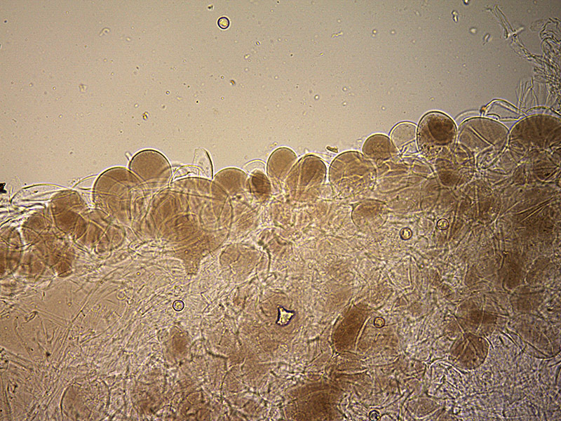 Pileipellis con struttuta a imeniderma, costituita da una palizzata di cellule globose, regolari, sferopeduncolate o clavate, con presenza di pigmento bruno disciolto. Osservazione in acqua.
