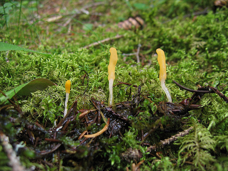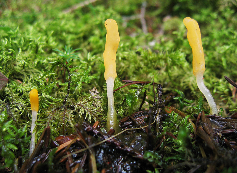 Mitrula paludosa Fr. : Fr.; Ascomicete stipitato; con apotecio di colore giallo, da allungato a conicheggiante; talvolta anche spatoliforme, più o meno piegato e ritorto. Gambo liscio, biancastro. Fruttifica sia isolata che gregaria su detriti vegetali intrisi di acqua, talvolta anche emergendo detriti vegetali immersi nell'acqua. Potrebbe ricordare Vibrissea truncorum che, pur prediligendo habitat simile, ha apotecio più o meno globoso e gambo non liscio e colorato in quanto coperto da squamette scure. Foto e commento di Alessandro Francolini