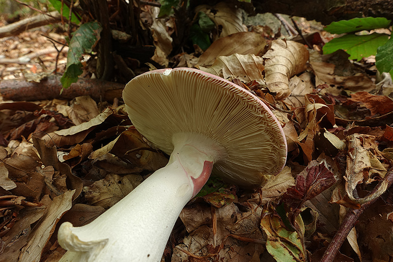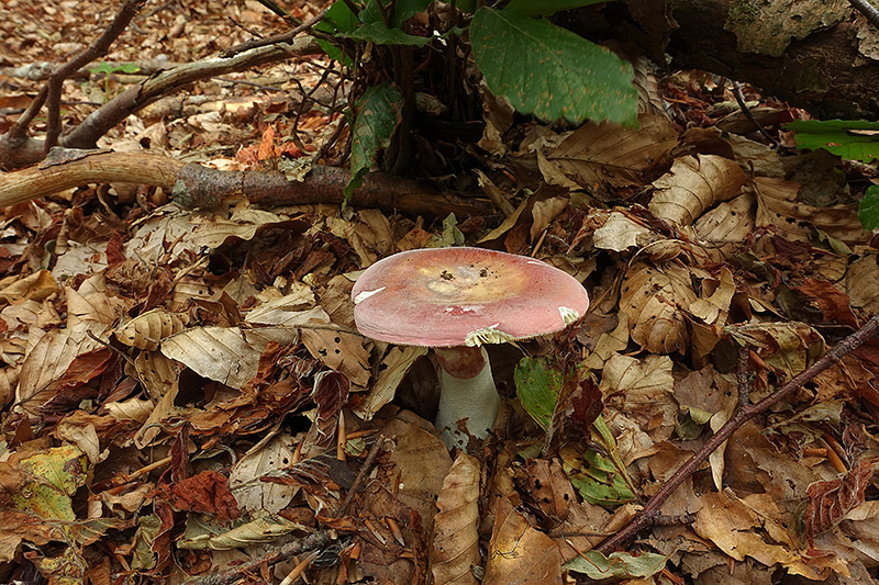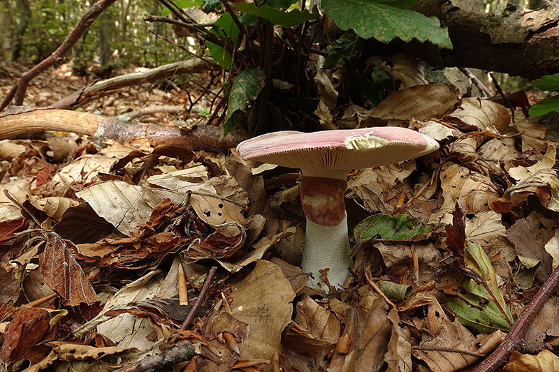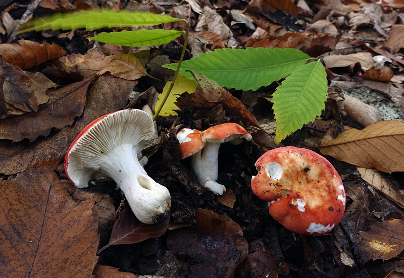 Russula aurora; una Russula dalla carne dolce e dalla sporata bianca. Cappello inizialmente subgloboso per passare col tempo nei vari stadi tipici di molte Russula: convesso, piano-convesso, infine un po’ depresso al centro. La cuticola è liscia e asportabile fino a metà del raggio pileico; di colore variabile dal rosa tenue al rosso più o meno intenso ma sempre con tendenza a decolorarsi nel centro su tonalità crema-rosate o crema-ocracee pallide. Lamelle fitte, bianche, leggermente sfumate di crema pallido a maturazione, sovente biforcate al gambo. Quest’ultimo si presenta cilindrico e quasi sempre ingrossato alla base ma anche, raramente, affusolato in basso; di colore bianco con eventuali macchie brunastre se manipolato; di solito senza sfumature rosate o giallastre. La carne è dapprima soda per divenire molle in età e con tendenza a ingiallire. Sapore dolce e odore leggero (o impercettibile) variabile tra il fruttato e quello tipico di Scleroderma (sgradevole, come di gomma surriscaldata). Habitat preferenziale sotto latifoglia, dalla tarda primavera all’autunno; più rara sotto conifere. Foto di Alessandro Francolini