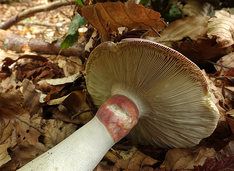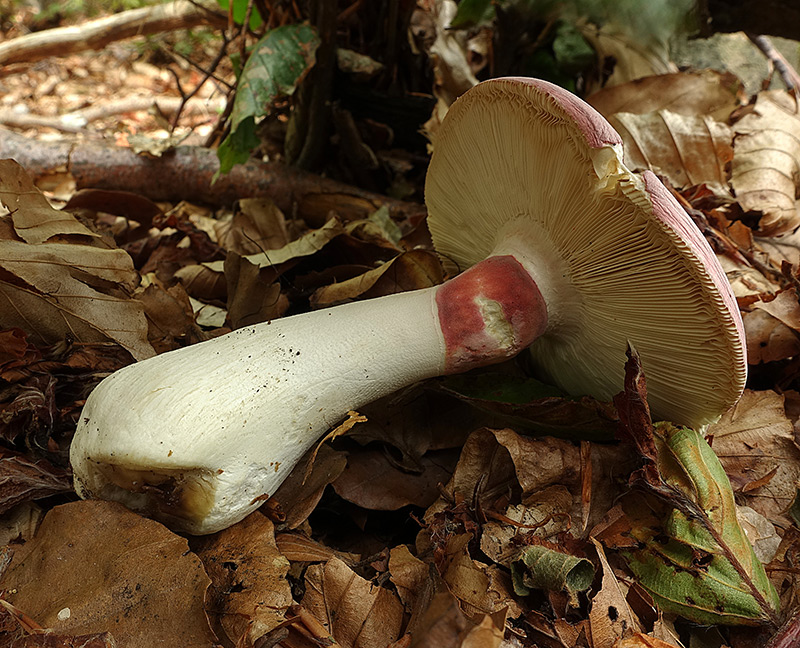 Russula aurora; un poco risecchita per la stagione arida; presenta una "malformazione" verso l'apice del gambo tale da somigliare a uno pseudo-anello; foto di Alessandro Francolini