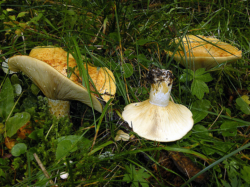 Lactarius scrobiculatus; la colorazione gialla brillante del pileo (più o meno zonato), le lamelle biancastre-gialline e prive di sfumature rosate, il gambo biancastro costellato da scrobicoli più scuri e l'habitat presso Abete rosso sono le peculiarità di questa raccolta. Foto e commento di Massimo Mantovani