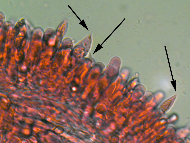Macrocistidi acuminati con piccole spinule all'apice (indicate dalle frecce); Lactarius blennius (Fr. : Fr.) Fr.; foto di Massimo Biraghi