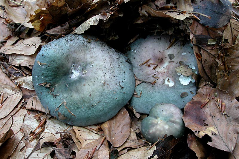 Russula cyanoxantha (Schaeff.) Fr.: come suggerisce il nome (dal greco kýanos = azzurro; e xanthós = giallo), la gamma cromatica del suo cappello è molto ampia: dal viola al verde, attraverso tonalità bluastre o giallastre; anche se esemplari giovani possono presentare colorazioni uniformi di ciclamino. Tali colorazioni in genere sono presenti e frammiste nello stesso esemplare creando un aspetto cromatico come metallizzato. La cuticola pileica è parzialmente asportabile (per 2 quinti del raggio) e la carne sottostante ha tonalità lilacine. Gambo e lamelle sono bianchi, con qualche macchia rugginosa in vecchiaia. Carne bianca dal sapore dolce come di nocciola. Cresce dall’estate al tardo autunno nei boschi di latifoglie. Caratteristiche sono anche le sue lamelle particolarmente lardacee.