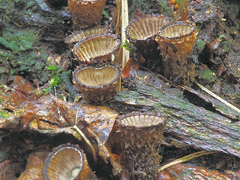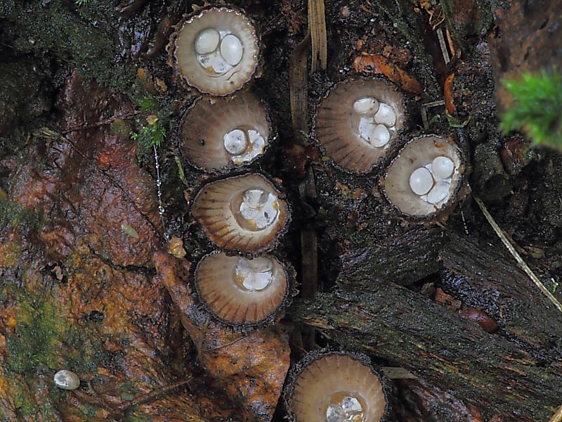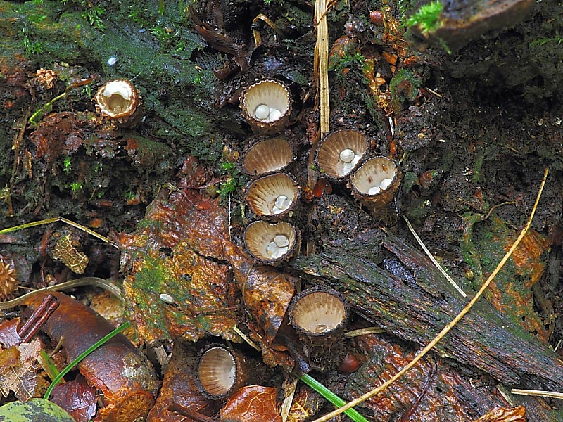 Cyathus striatus; primordi (sulla sinistra) e esemplari ancora immaturi (sulla destra), con l'epifragma che ancora chide la coppetta; foto di Tomaso Lezzi