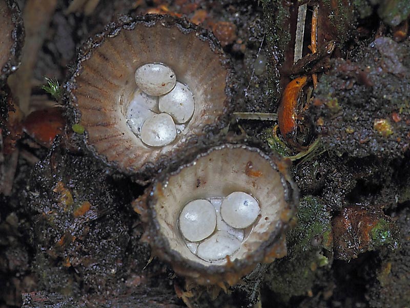 Foto macro dei peridioli ricoperti di una sostanza biancastra, mucillaginosa chiamata "tunica". In Cyathus striatus; foto e commento di Mario Iannotti