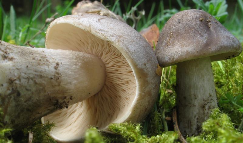 Melanoleuca cognata; in due stadi dello sviluppo: a sinistra già matura, a destra più giovane, col cappello non ancora disteso e aperto; foto di Pietro Curti