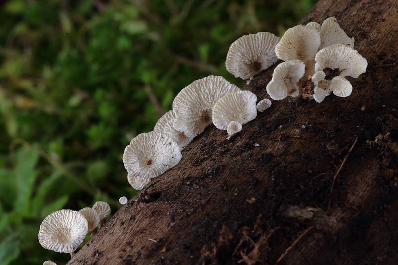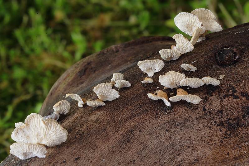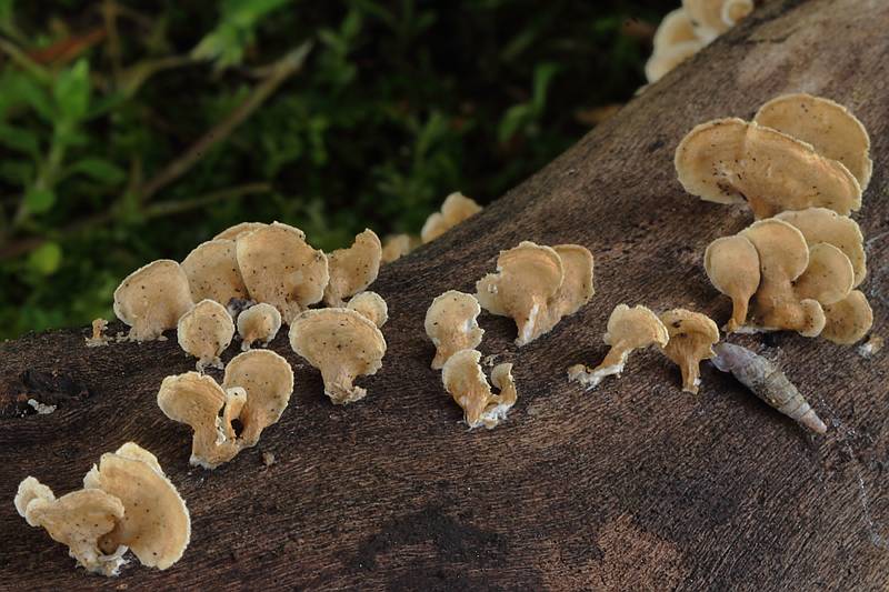 Plicaturiopsis crispa (Pers. : Fr.) D.A. Reid; piccolo lignicolo (2-3 cm di diametro) che cresce su rami a terra di latifoglie, Faggio in particolare. Aspetto da flabelliforme o conchiforme, con bordo da lobato a increspato. Presenta superficie sterile villosa, più o meno scanalata e di colore da brunastro-ocraceo a rosso-giallastro; il bordo è più chiaro, biancastro. Imenoforo costituito da pliche in rilievo, radiali e flessuose, biancastre. Ha carne sottile e consistenza tenace. Foto di Nicolò Parrino
