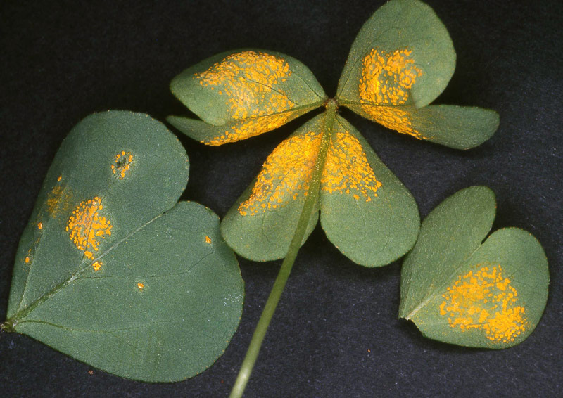 Numerosi ecidi di Puccinia oxalidis Dietel & Ellis su Oxalis sp.; foto di Mauro Cittadini