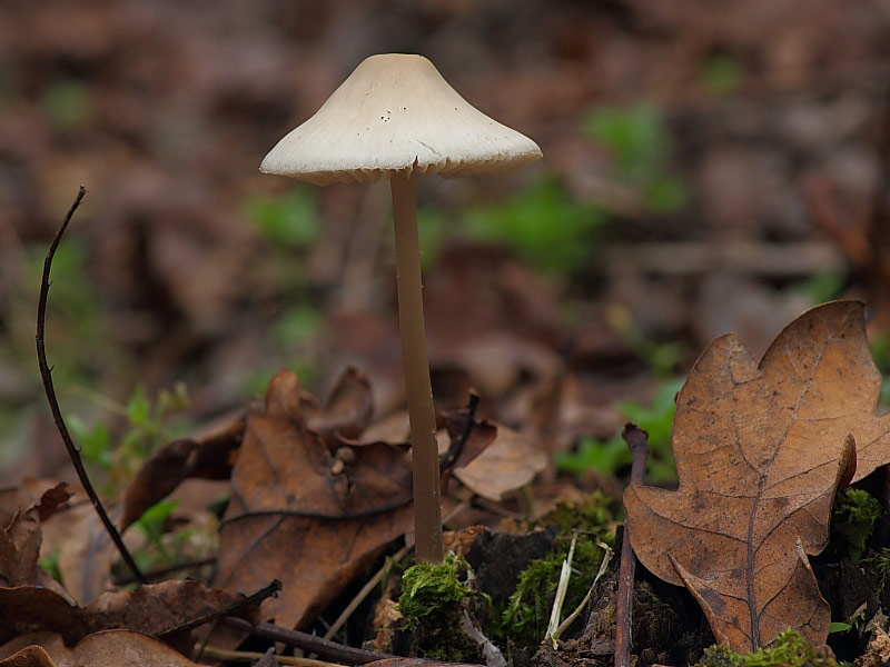 Mycena galericulata; su ceppo di latifoglia; pileo fino a 4 cm; lamelle ventricoso-smarginate prima bianco grigiastre poi rosate, fortemente anastomosate; carne con odore di buccia d'anguria o farina, sapore farinoso.